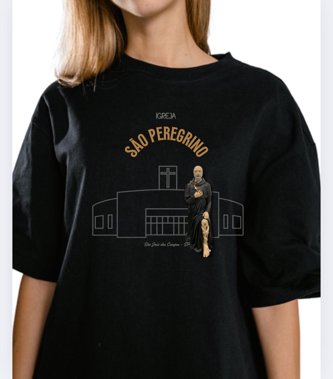 Camiseta exclusiva da Igreja São Peregrino, com a frase “Eu ❤️ a Igreja São Peregrino” estampada na frente e o desenho da igreja nas costas. Confortável e estilosa, é perfeita para demonstrar seu amor e devoção.
